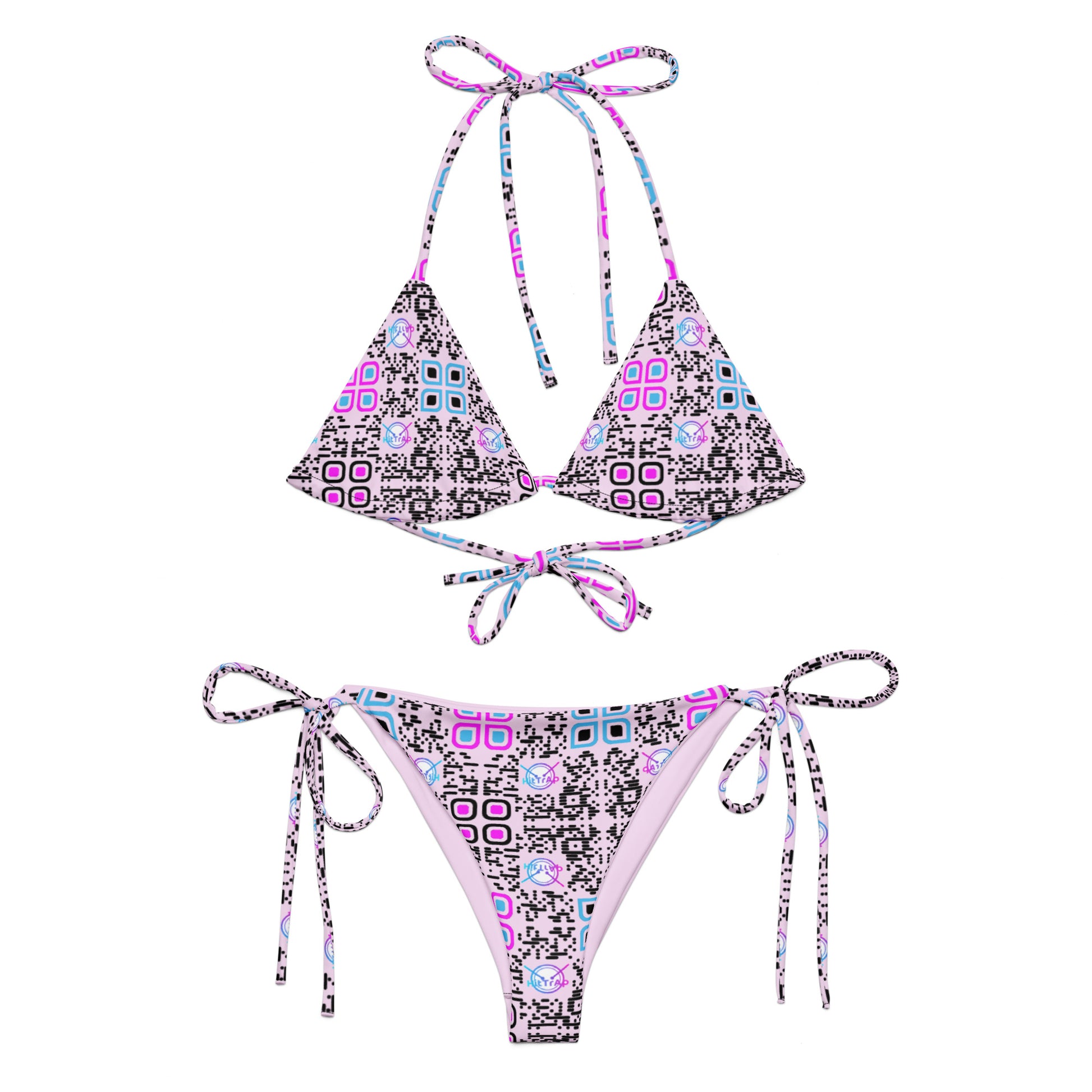 All-over print recycled string bikini (Pink, Black Code Pattern)