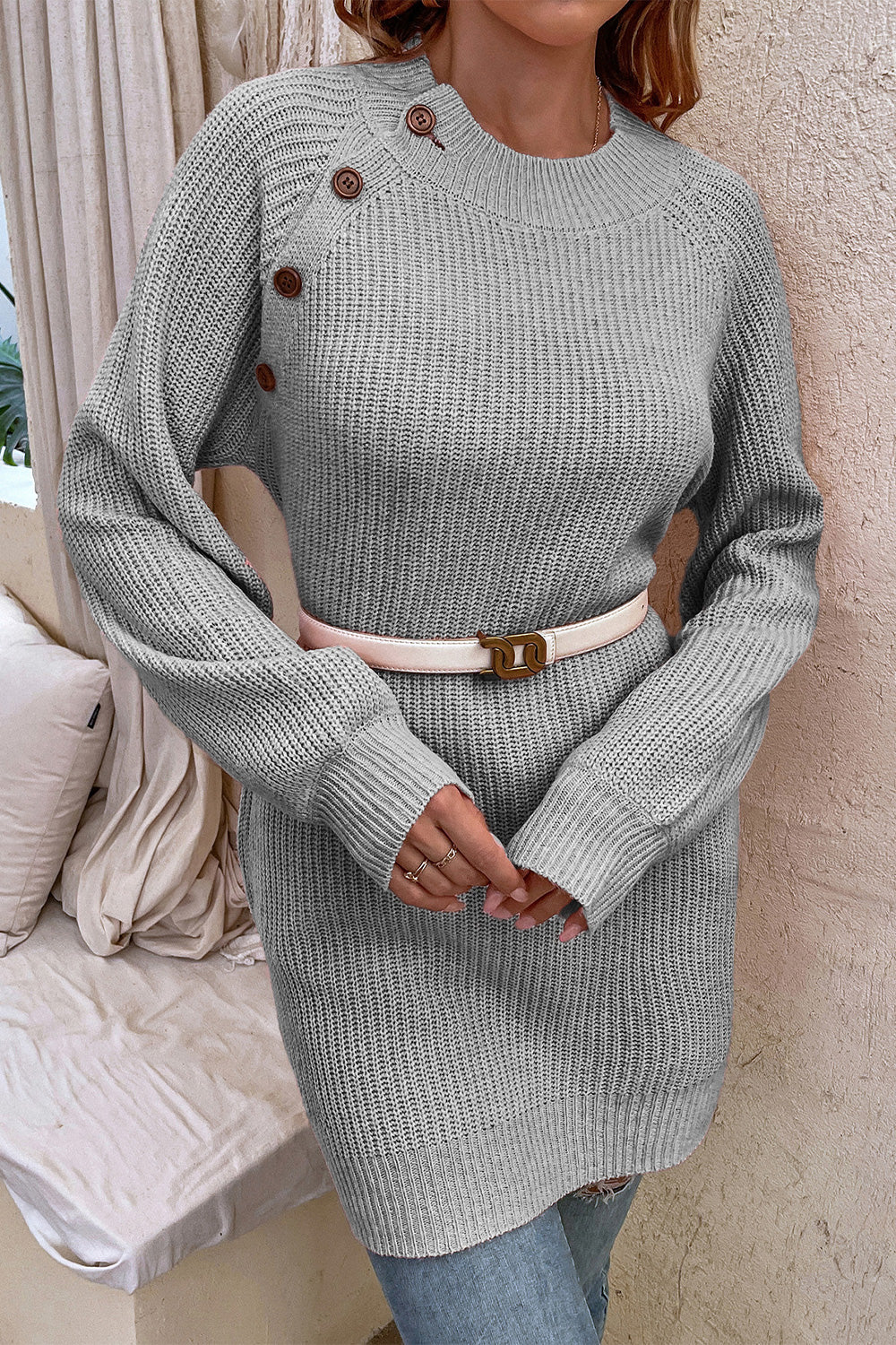 Round Neck Button Detail Ribbed Sweater