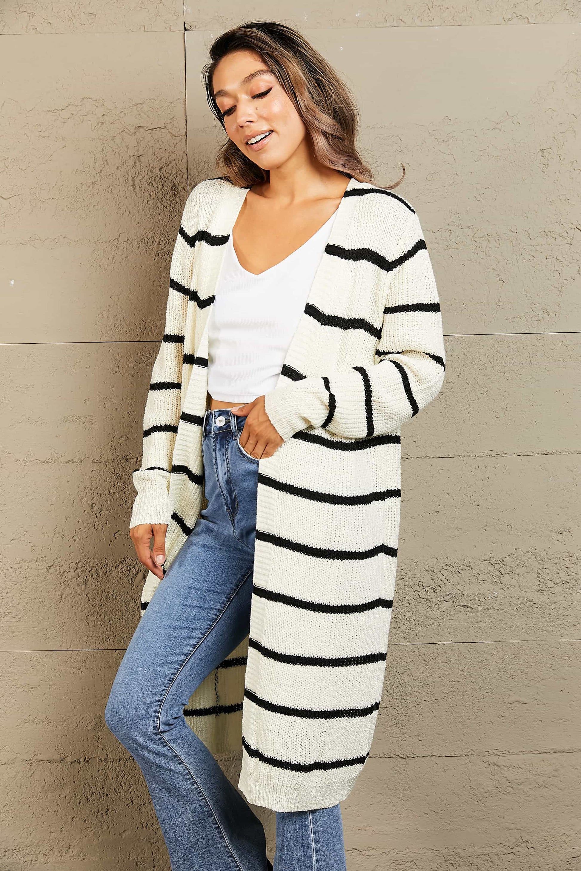Woven Right Striped Open Front Rib-Knit Duster Cardigan